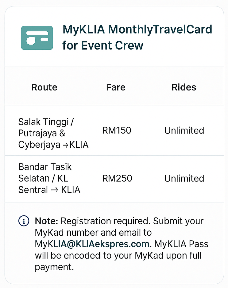 - Arrival at KLIA Terminal 2 (KLIA 2): Take Airport Linear Shuttle Bus (RM2.50, 15-20 minutes) to KLIA Terminal 1, then buggy service.